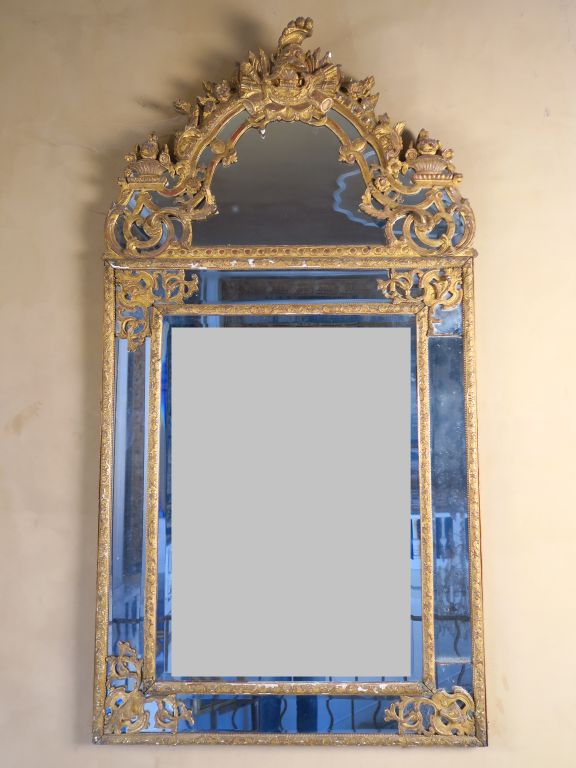 Glace à parcloses Régence en bois sculpté et doré, à décor de trophée, de vases de fleurs, de rinceaux feuillagés et de rocailles. 194 x 102 cm (petits accidents)
