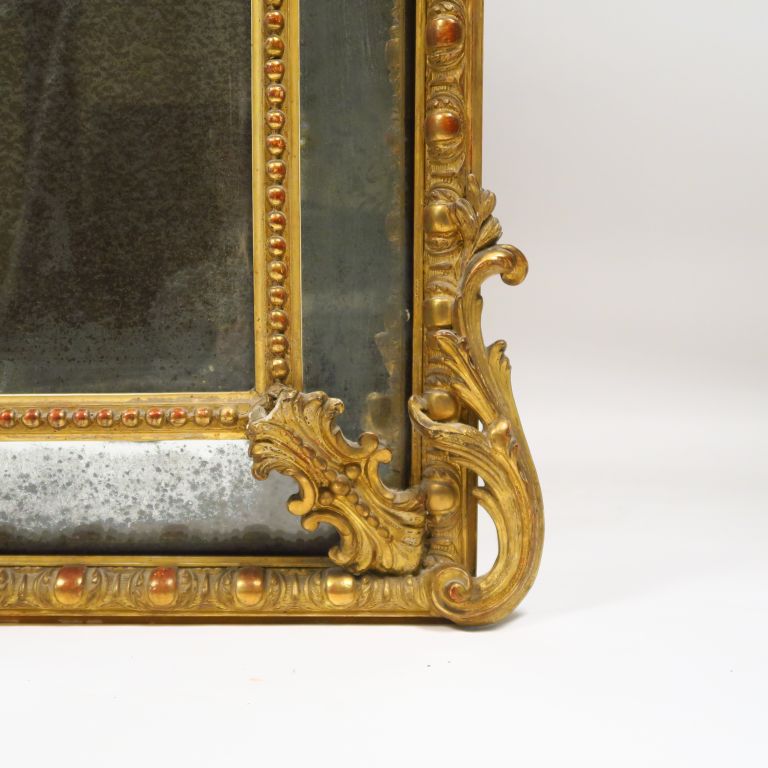 Glace à parecloses Napoléon III en bois et stuc doré, à décor de perles, de rinceaux et de coquille. (accidents). Dim. 118 x 92 cm