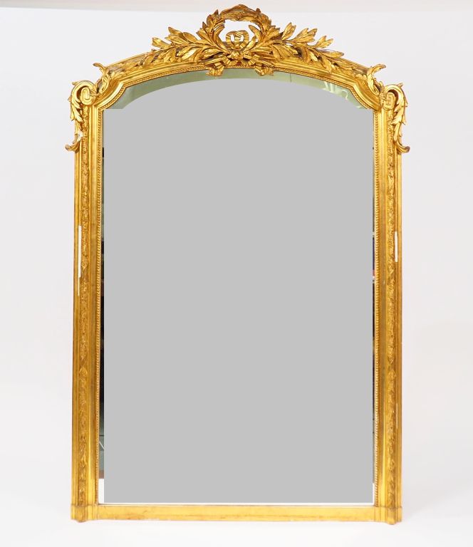 Glace de cheminée Napoléon III de style Louis XVI, en bois et stuc doré, petit fronton ajouré à décor de guirlandes de feuilles de laurier. Dim. 177 x 117 cm (petits accidents)