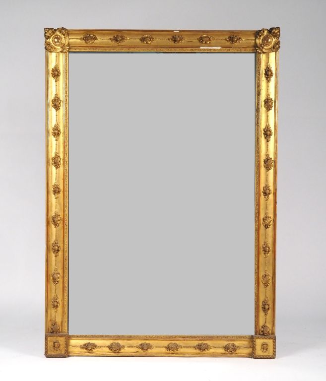 Glace de cheminée Napoléon III en bois et stuc doré, à décor de frise de grenades éclatées et de cartouche feuillagé. Dim. 164 x 116 cm