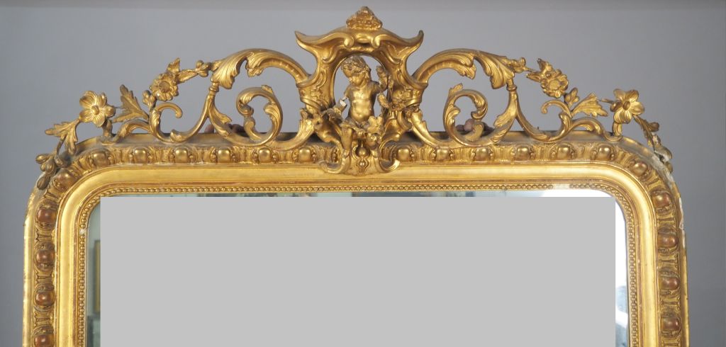 Glace de cheminée Napoléon III en bois et stuc doré à décor de perles et de godrons, surmonté d'un fronton ajouré agrémenté d'un amour et d'une guirlande de feuillage. 203 x 120 cm. (petits accidents)