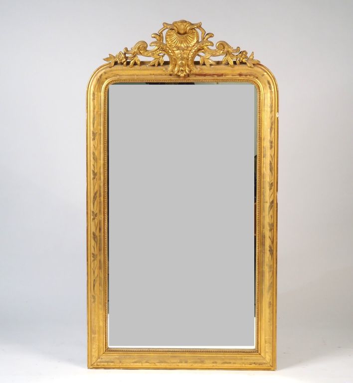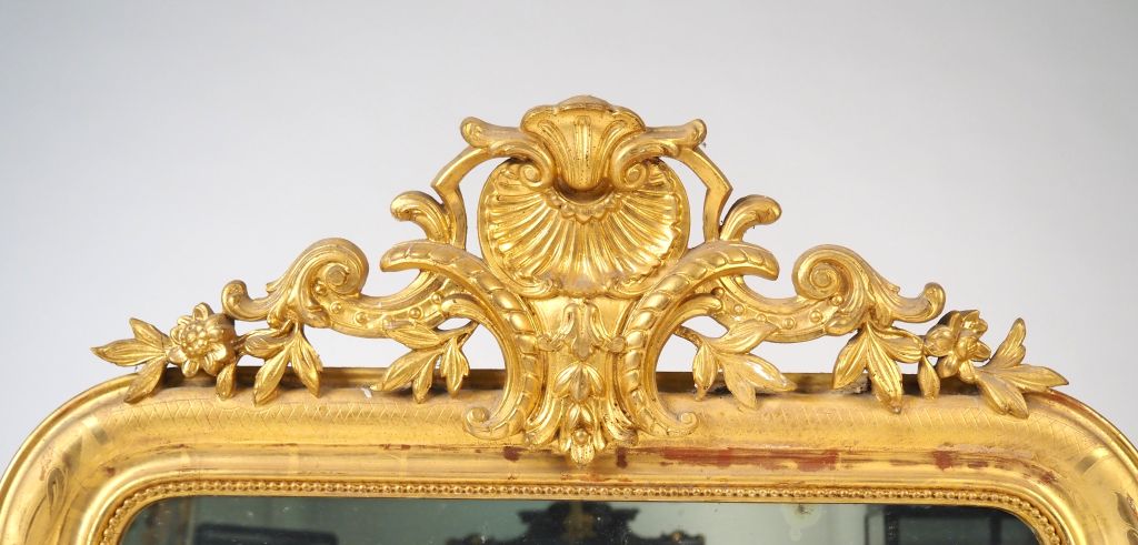 Glace de cheminée Napoléon III en bois et stuc doré, petit fronton ajouré à décor de coquille, de feuillage et de fleurs. Dim. 158 x 87 cm