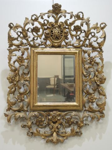 Glace de style italien en bois et stuc doré ajouré, à décor de fleurs de rinceaux feuillagés, et d’un monogramme au centre du fronton (petits accidents) , 100 x 80 cm glace biseautée postérieure