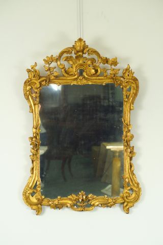 Glace de style Louis XV en bois doré, à décor de rinceaux feuillagés (accidents). 100 x 67,5 cm
