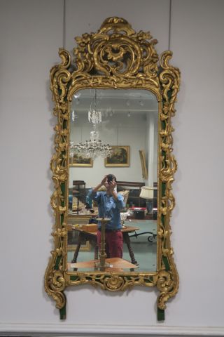 Glace Louis XV en bois sculpté, ajouré et doré, à décor de rocaille et de fleurs. 200 x 88 cm