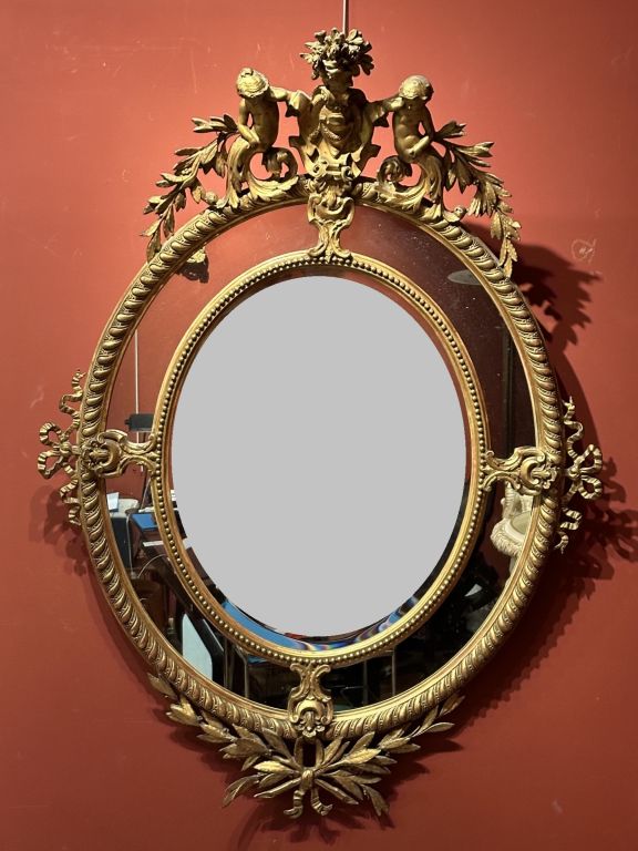 Glace médaillon à parecloses de style Louis XVI en bois et stuc doré, à décor de perles, de godrons, de feuillage, fronton à décor de deux enfants entourant un cartouche fleuri. Dim. 158 x 115 cm