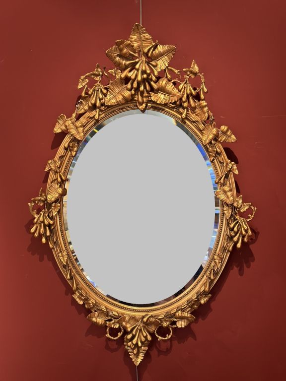 Glace médaillon Napoléon III en bois et stuc doré, à décor de grappes de fruits et de feuilles. Dim. 138 x 94 cm