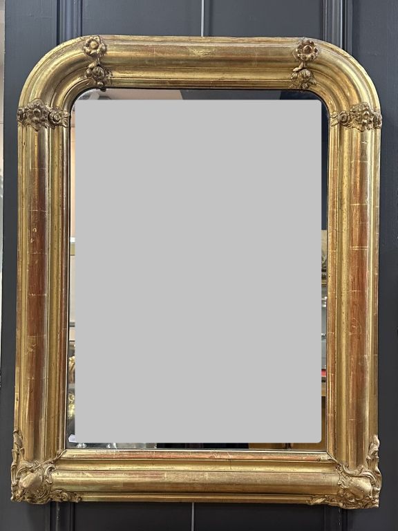 Glace Napoléon III, cadre en bois et stuc doré, à décor de fleurettes et de cartouches feuillagés. Dim. 90 x 71 cm