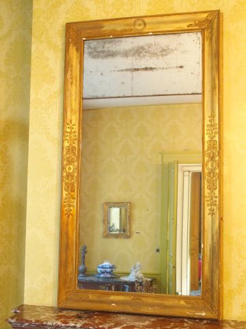 Glace trumeau Restauration en bois et stuc doré, à décor de feuillage (petits accidents). Dim. : 117 x 96