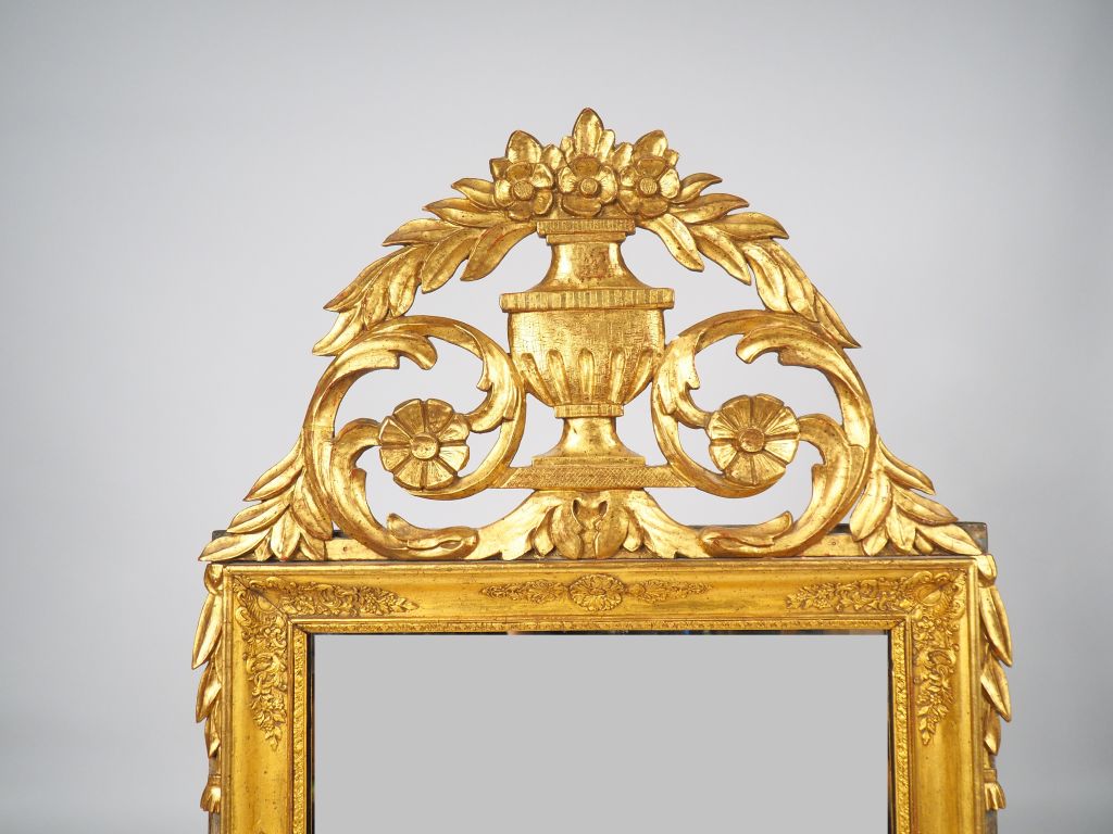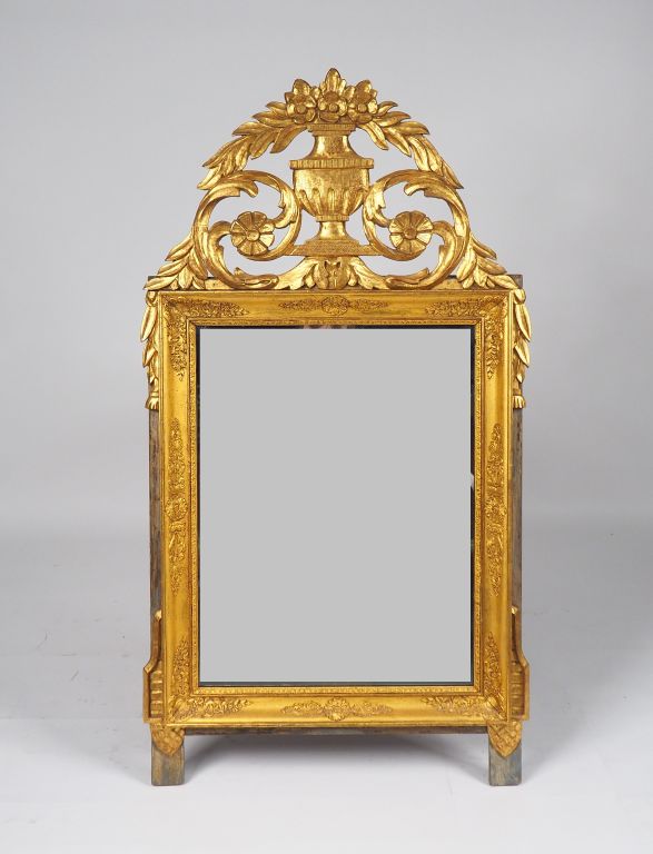 Glace XIXème de style Louis XVI en bois et stuc doré à décor de rinceaux feuillagés et feuilles de laurier, surmontée d'un fronton à décor ajouré d'un vase fleuri. Dim. 137 x 74 cm.
