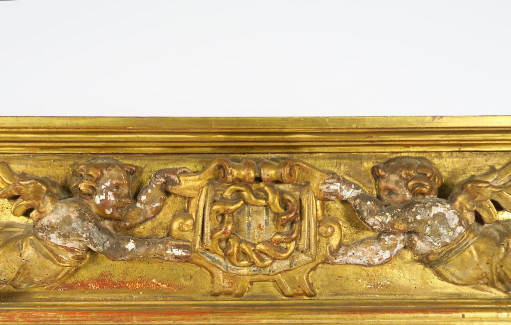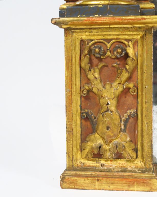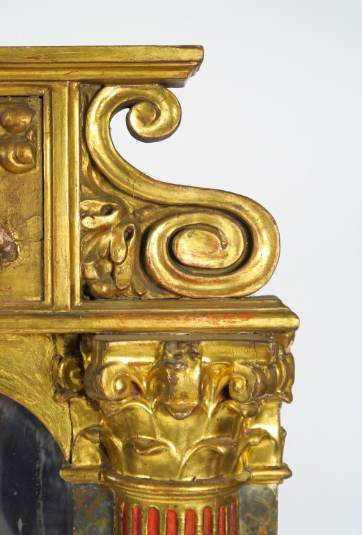 Glace XVIIème en bois polychrome, stuc doré et faux marbre à décor de colonnes corinthiennes cannelées et d'anges. Dim. 153 x 121 cm (accidents)