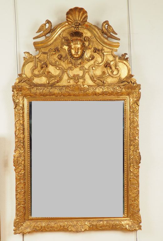 Glace XVIIIème en bois et stuc sculpté doré. Fronton à décor de mascaron, et d'oiseaux entourant une une coquille. Dim. du cadre: 154 x 88,5 cm. Dim. de la glace: 80 x 66 cm.