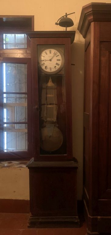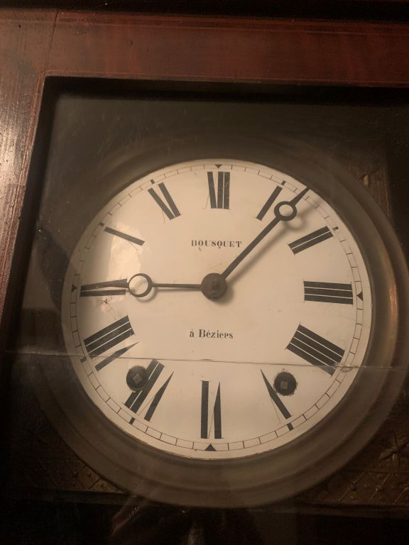 Grand carillon régulateur de parquet, mouvement signé Bousquet à Béziers. Dim. 240 x 66 x 33 cm (mauvais état).