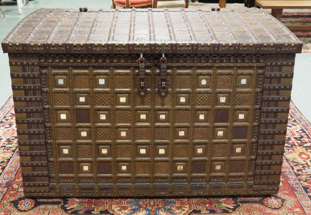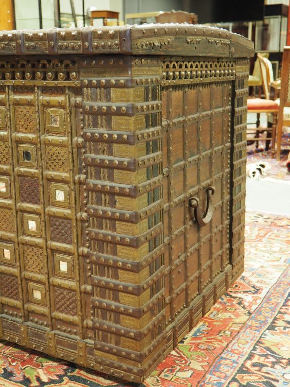 Grand coffre indien en bois et métal orné de carrés de miroir. Travail fin XIXème