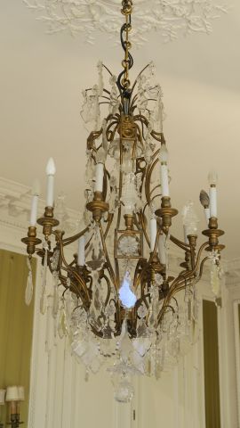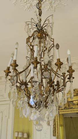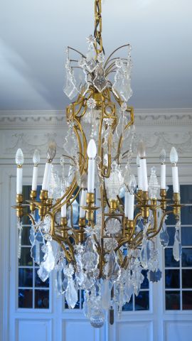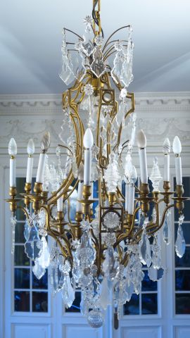 Grand lustre à pampilles de style Louis XV en bronze et cristal, éclairant à 16 lumières