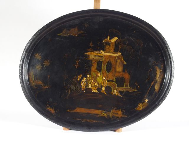 Grand plateau Napoléon III en tôle noire à décor laqué à décor Extrême-Orient. 50 x 75,5 cm