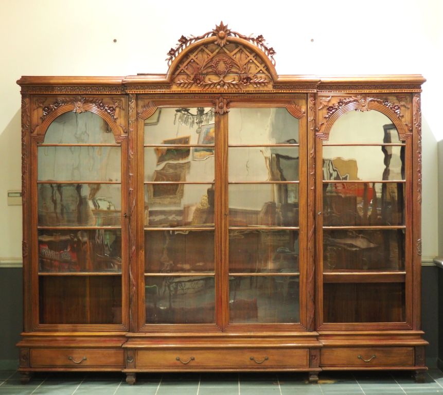 Grande bibliothèque de style Louis XVI en bois exotique, à décor de feuillage, de croisillons et de tiges enrubannées, ouvrant à quatre portes et trois tiroirs en partie inférieure, corniche à fronton. Dim. 275 x 308 x 50 cm