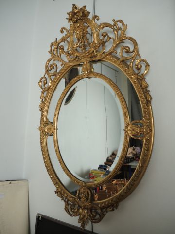 Grande et belle glace médaillon Napoléon III en bois et stuc doré, surmonté d'un fronton ajouré à décor de feuillage, de fleurs et de rocailles. 156,5 x 97 cm