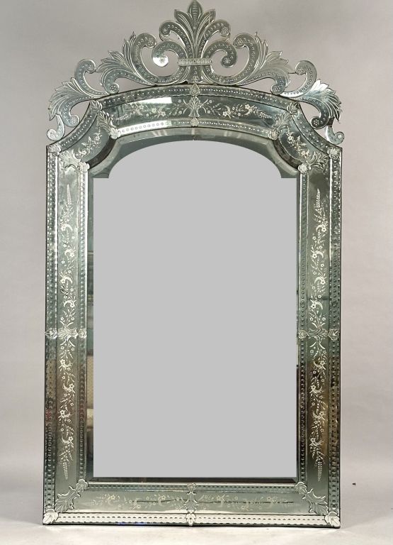 Grande et spectaculaire glace de cheminée en verre de Venise, à décor de feuillage, de fleurs et de pampres. Dim. 250 x 141 cm (deux petits manques)
