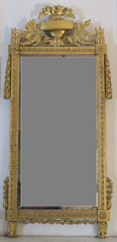 Grande glace de cheminée Louis XVI en bois sculpté et doré, à décor de feuillage et de cabochons, surmontée d’un fronton ajouré à décor de vase fleuri et feuillagé 220 x 103 cm