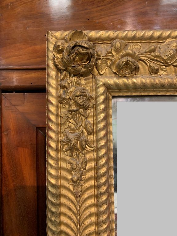 Grande glace de cheminée Napoléon III en bois et stuc doré, à décor guilloché sur le tour et de roses dans les angles. Dim. 207 x 104 cm