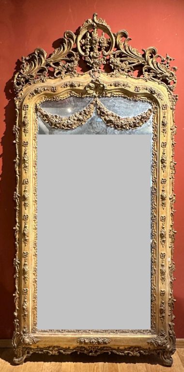 Grande glace de cheminée Napolon III en bois et stuc doré, à décor de fleurs, de rocailles et de feuillage, fronton ajouré. Dim. 258 x 124 cm (légers éclats et fentes)