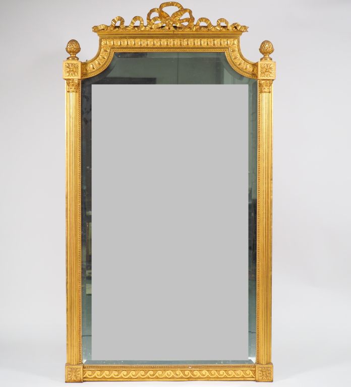 Grande glace en bois et stuc doré, de style Louis XVI à décor de frise de perles, de nœuds de rubans et de pommes de pin. Dim : 189 x 105 cm