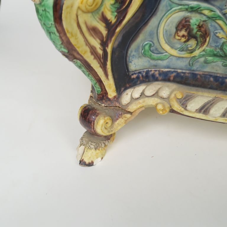 Grande jardinière Napoléon III en faïence fine, à décor polychrome en relief de faunes et de mascarons, pieds en sabot de biche. (pieds accidentés, fels)