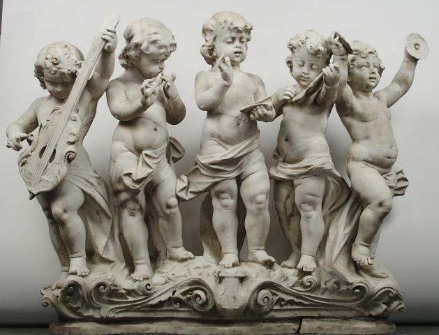 Groupe en marbre sculpté 'amours musiciens'. Dim. (petits accidents)