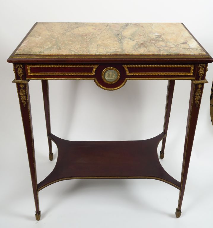 Gueridon de style Louis XVI en acajou et placage d'acajou, orné de deux médaillons en Wedgwood. Dessus marbre brèche encastré. 80 x 67 x 42,5 cm (accident au marbre)