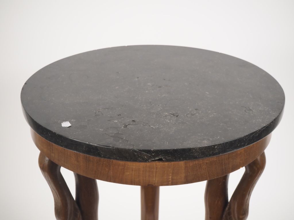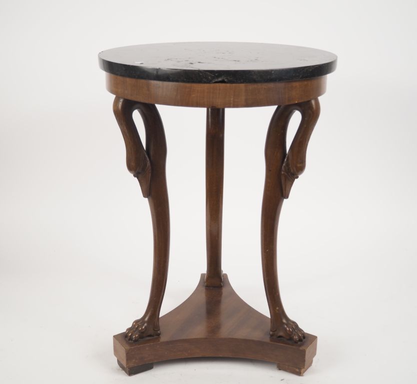 Guéridon Napoléon III de style Empire à plateau circulaire, montants à cols de cygne, piètement griffe tripode. Dessus marbre noir. Dim. 53 x 39 cm. (Petit accident au marbre).
