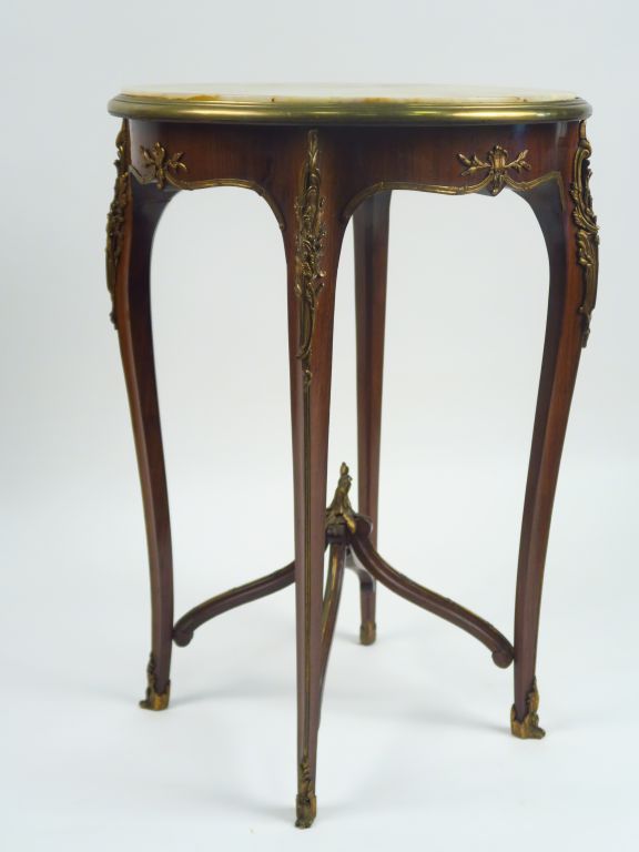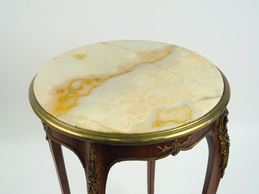 Guéridon Napoléon III en acajou, ornementation de bronze, dessus marbre blanc. Dim. 78 x 53.5 cm