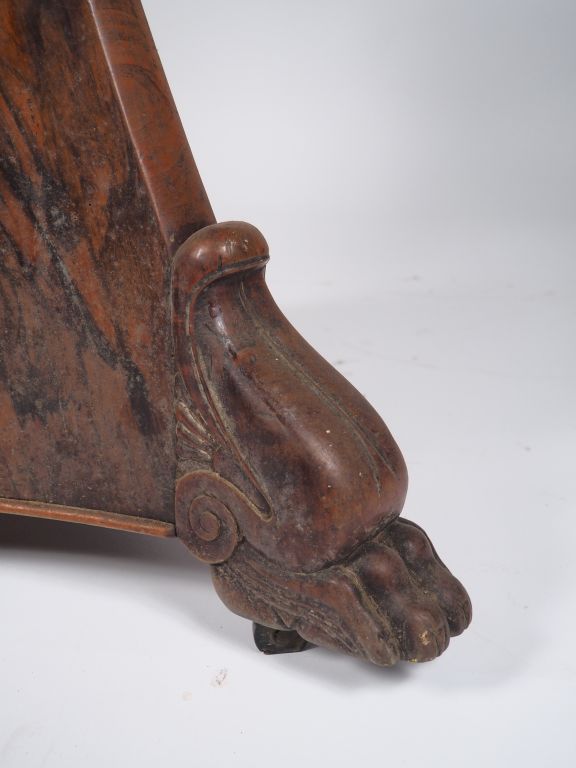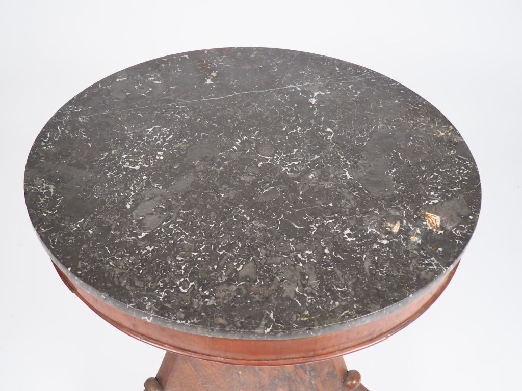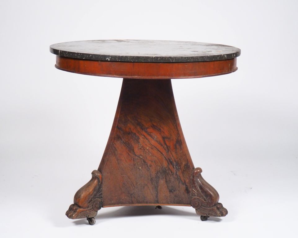 Guéridon Restauration en noyer et placage de noyer, pieds griffe dessus marbre gris. H. 74 cm Diam. 82 cm (accidents)