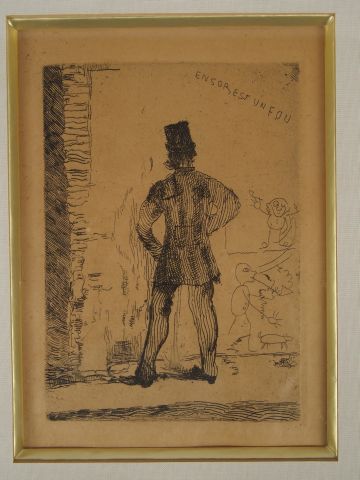 James Ensor (1860-1949) 'Le Pisseur'. 1887. Eau-forte. L. 105 x H. 145 mm (marges : 160 x 248 mm). Taevernier 12. Belle épreuve sur japon, légèrement oxydée à l’ouverture du passe-partout, fixée au verso le long des bords par de l’adhésif brun, avec petites épidermures. Trois petites taches brunes visibles exclusivement au verso (petits corps étrangers oxydés). Bonnes marges. Expert : Hélène Bonafous-Murat. Tél. 01 44 76 04 32, hbmurat@orange.fr