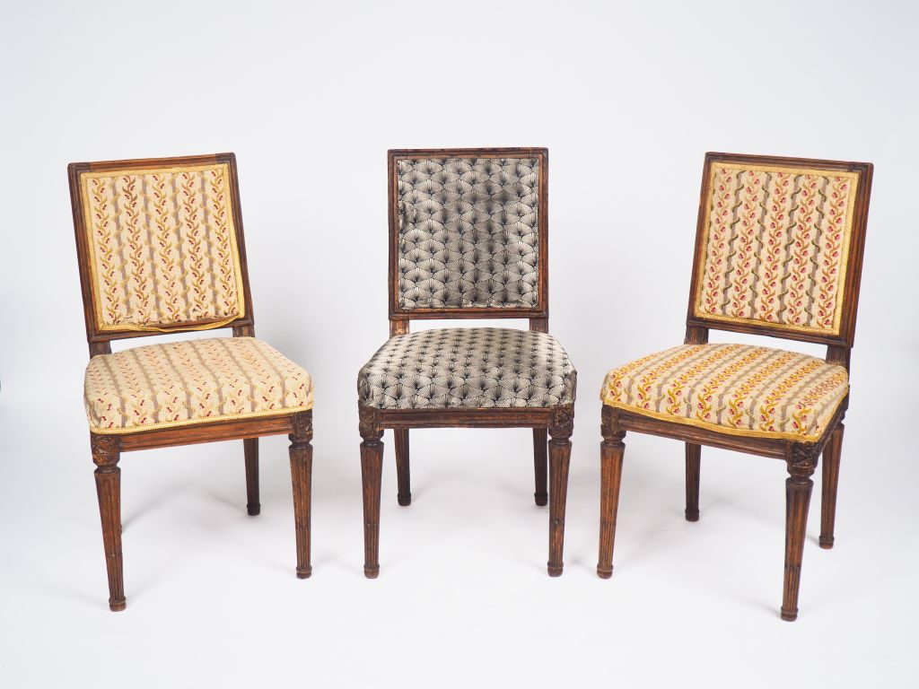 Jean AVISSE. 3 chaises Louis XVI en bois mouluré pieds cannelés. Estampillées. Dim. 82,5 x 43 x 39,5 cm. (Ganrniture dépareillée et posterieure).