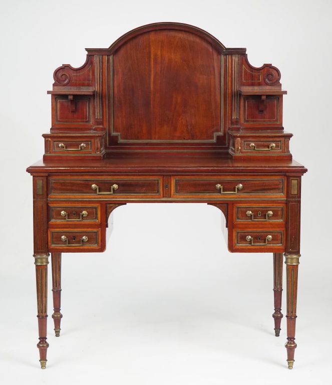 KRIEGER. Bonheur du jour de style Louis XVI en acajou et placage d'acajou, pieds fuselés et cannelés, ornementation de laiton. Signé (petits accidents) Dim. 120 x 100 x 51 cm
