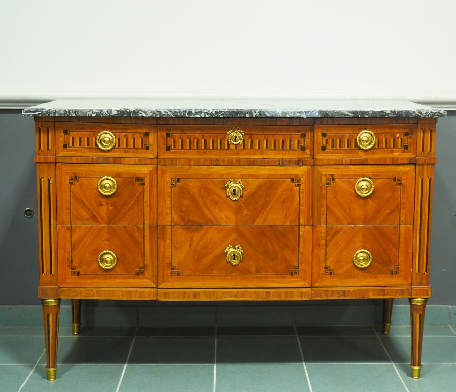 LACROIX. Commode Louis XVI en marqueterie à décor de grecques et de cannelures en trompe l'œil, ouvrant à 3 tiroirs en ceinture dont deux sans traverse, dessus marbre gris, ornementation de bronze doré Estampillée. Dim. 86 x 125 x 54 cm. (Restaurations, marbre accidenté).