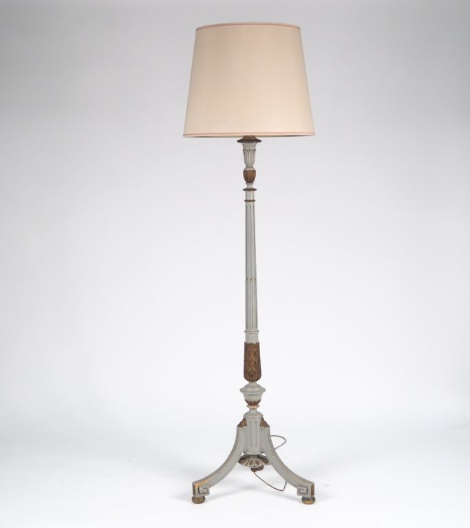 Lampadaire tripode de style Louis XVI en bois laqué gris et patiné. H. 155 cm