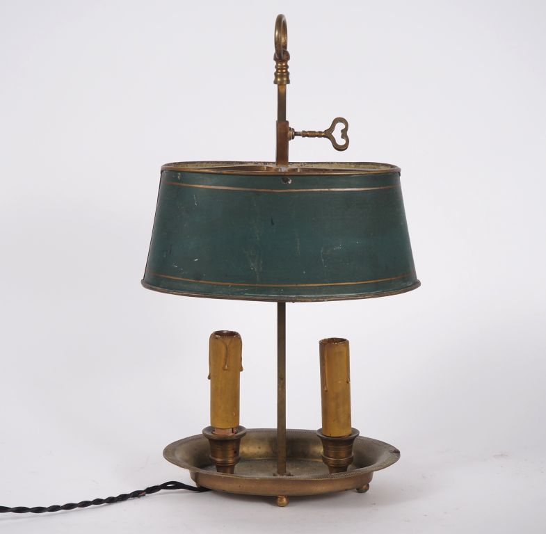 Lampe bouillote de style Empire en laiton, abat-jour réglable en tôle verte. Dim. 41 x 23 x 11 cm.