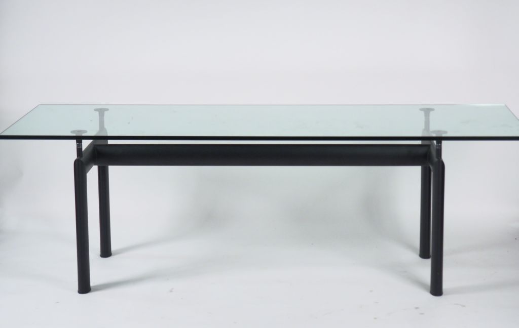 LE CORBUSIER (d'après). Grande table de salle à manger modèle lC6 en métal chromé noir et verre. Dim. 72 x 224 cm