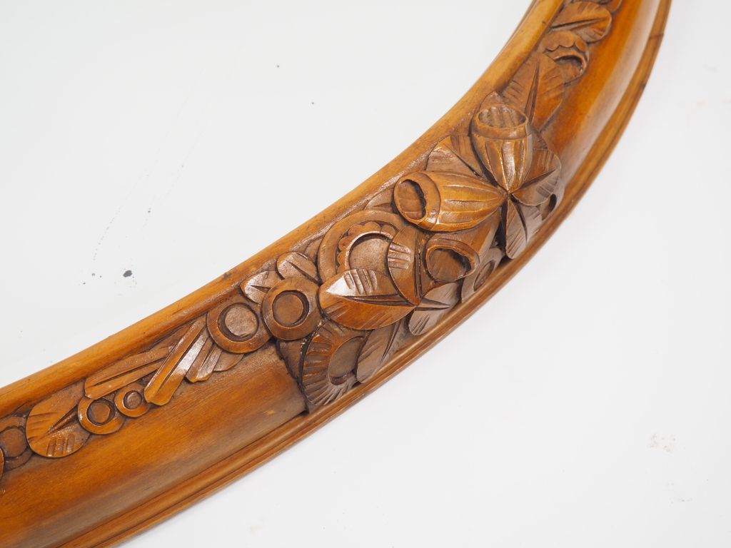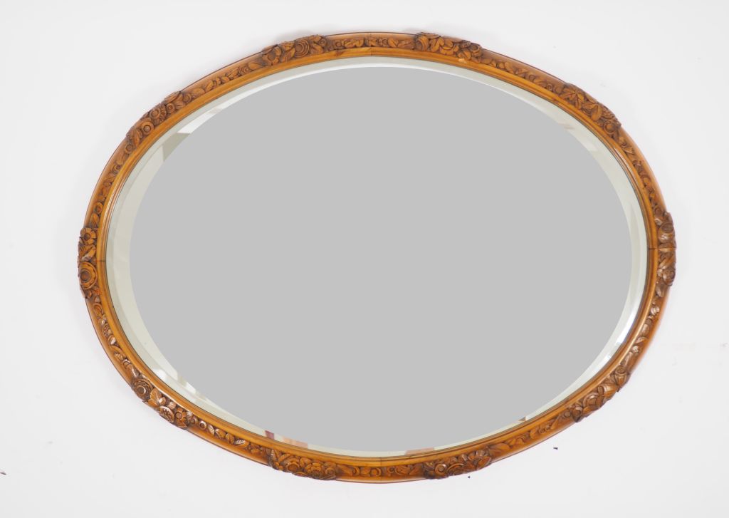 Léon JALLOT. Grand miroir ovale cadre en bois sculpté à décor de fleurs. Signé du monogramme. Dim. 100 x 76 cm