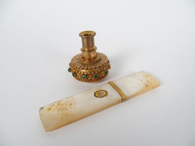 Longue vue de col Napoléon III en pomponne, nacre et pierres de couleur. On y joint un étui XIXème en nacre (petit accident)