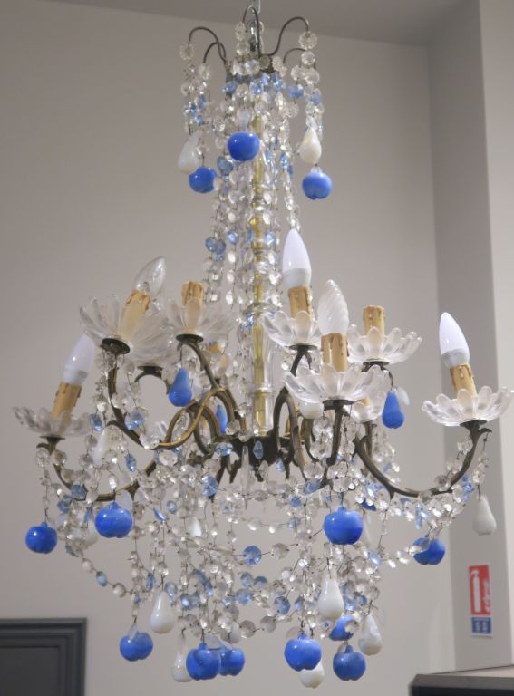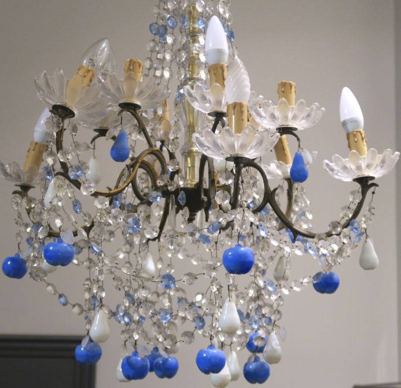 Lustre à pampilles en verre, oplaine bicolore et bronze éclairant à 12 lumières, à décor de fruits