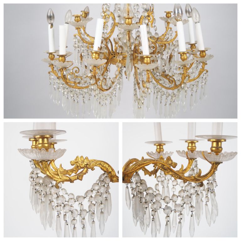 Lustre à pampilles fin XIXème en métal doré et cristal, éclairant à dix huit lumières et une paire d'appliques assorties, éclairant à trois lumières.