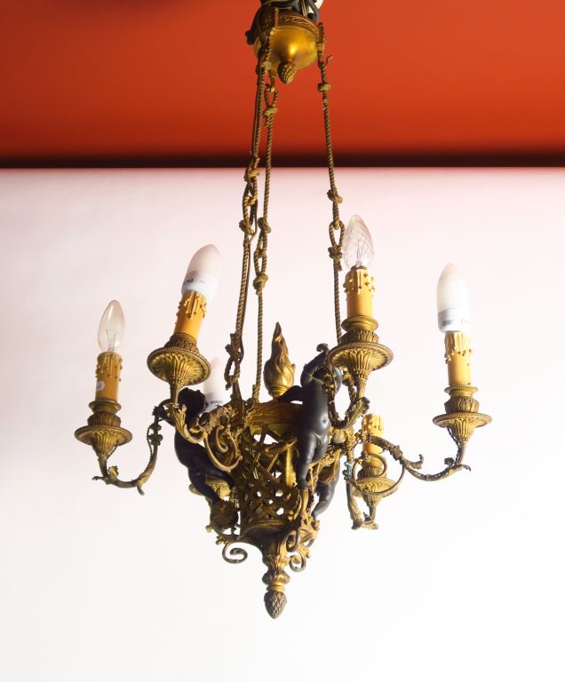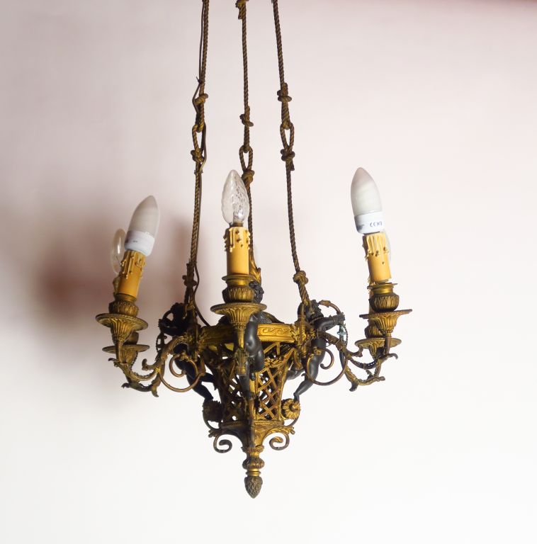 Lustre de style Louis XVI en bronze patiné et ajouré, à décor d’amours. Eclairant à 6 lumières. H. 90 cm