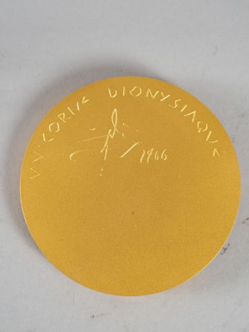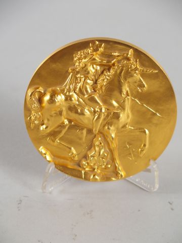 Lot de Médaille en bronze doré, signée Dali et datée 1966 'Unicorne dionysiaq au prix de 200 à 300 € en vente aux enchères par l'hôtel des ventes Primardeco