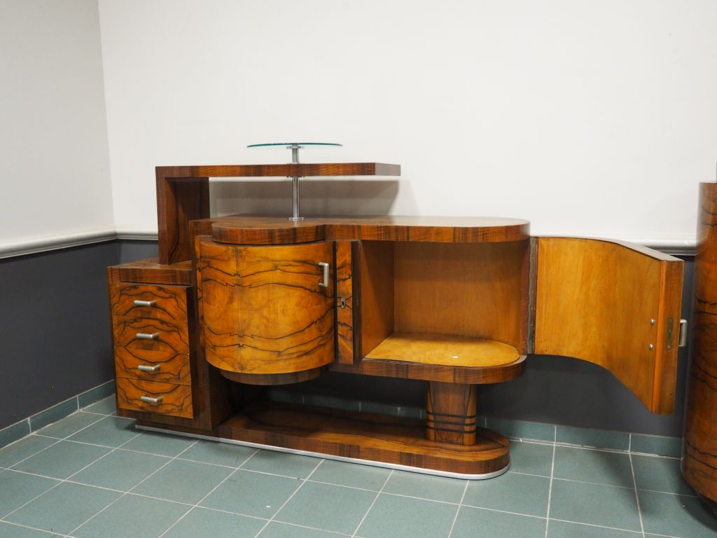 Meuble bar de style Art Déco en noyer et placage de noyer ouvrant à deux portes et quatre tiroirs. Base du piétement chromée. Dim. 130 x 190 x 74 cm