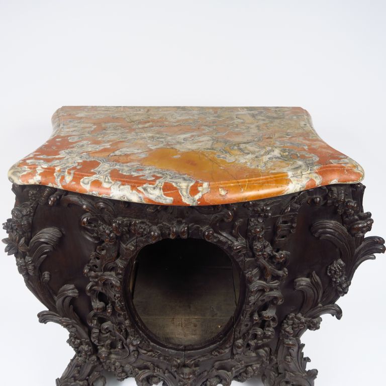 Meuble bas de style rocaille en chêne mouluré et fortement sculpté, à décor de feuillage, de rocailles et de fleurs, grand ovale central vide contenant autrefois un élément décoratif aujourd'hui disparu. Dessus marbre rouge. 99 x 93 x 63,5 cm