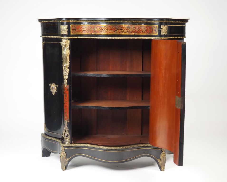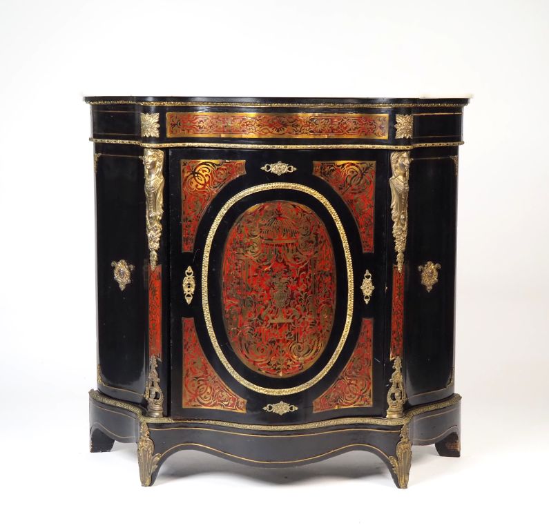 Meuble d'appui Napoléon III en marqueterie, facade et cotés violonnés ouvrant à une porte, ornementation de bronze et laiton doré à décor d'espagnolettes. Dim. 98 x 115 x 42,5 cm (petits accidents)