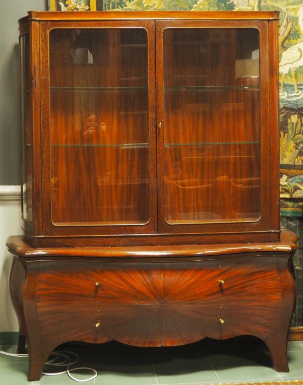 Meuble vitrine Napoléon III de style Louis XV en frisage, ouvrant à 2 portes vitrées et 4 tiroirs en partie inférieure. H. 180 x 145 x 45 cm.
